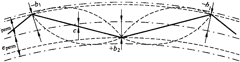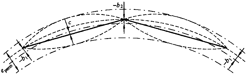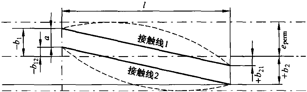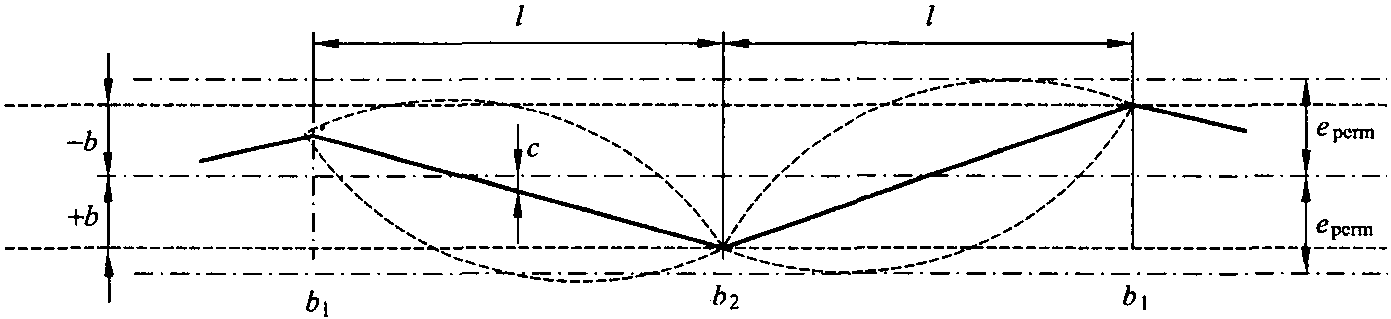 大曲線半徑處接觸線應(yīng)交替地側(cè)向位移以使其不超過(guò)emax。這種情況如圖6.8所示,b1≠b2